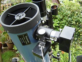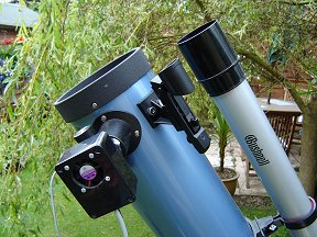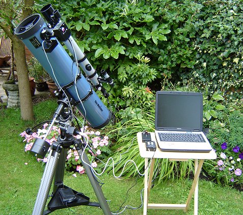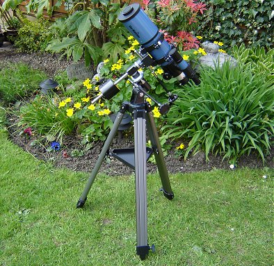 | The complete set-up. SkyWatcher 130m Reflecting Telescope with a Bushnell 60mm Refractor Telescope piggy-backed onto the EQ2 mount. | |
